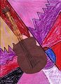 Taylor, wow I like it! It reminds me of when we are listening to music in the car and one of us plays the drums and one of us plays the guitar! I like how you can see all the strings on the guitar. The colors and shapes in the background are neat too; they help to bring a sense of excitement to the drawing. VERY COOL!!! Love you, Dad