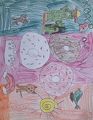 Zoe, I love this picture! It is so colorful and detailed! I especially love the sharks and seagulls! You are up there among my favorite artists. Your great, great gramma , Gma, would be so proud, she was an amazing artist too! I love you little one! Mimi