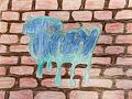 The graffiti background is interesting. The brick wall brings your eyes to the drawing, which provide good contrast to the blue and turquoise colors. Love it.