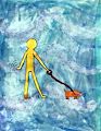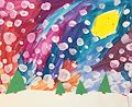 I love this winter scene. A red house with a snow covered roof and more snow coming down. I love the little dog looking like he is wanting to go over the bridge and go visit the snowman. The black birds who are flying in formation looking for someplace to land and get out of the cold. The birds will not be able to land in the tall skinny trees. Great job!!!