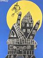 I love the haunted house. The different roofs that all have something spooky in the windows and the front door with the HELP sign. The little witch and her black cat on the broom in front of the big yellow moon really draw attention on the picture. The front porch with the little spooky characters is really cute.