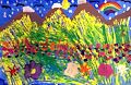 Caden the picture you made is beautiful. The colors are so pretty and bright. I love the flowers, sun and rainbow. Keep up the good work. We are proud of you and love and miss you.