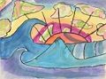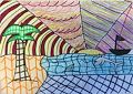 I love your beachscape, Enza! The patterns, lines, and colors make your scene interesting and give it movement. I wish I could swim with your dolphin (and even your shark)!
