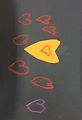 I love the contrast of the purple heart and the big yellow paper heart against the black background along with the cluster of red hearts. So cute!