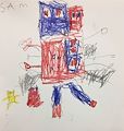 Really like the the way you balanced the colors red and blue in the body of your robot to give him more life/energy; I also love the yellow figure in the background, is that a cat? Love, Daddy