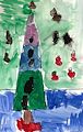 Stella we can tell from this picture that you love the holidays. You made 2 perfect trees and decorated them with such a festive design. Snow and snow falling is a detail that fits just perfectly in your winter scene. What’s the holiday without a box by the trees? Your design of the box is perfect including the tag. A nice touch with the snowman in the background. Love that detail. Stella your artwork is outstanding. Love you Grams and Grampy.