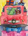 I like this drawing because it's a happy drawing. Someone is delivering gifts on Christmas. What could be better than this. I like the fact that you can see all of the individual presents, with a Christman tree riding shotgun. I also like that the candy cane is driving. Well done.