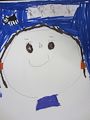 Abbie, I did not even have to look at your name to tell the picture is of you! Just as you have, your self-portrait has your hair in braids with red ties at the ends with you wearing a purple shirt. You even included eyelashes and eyebrows. Of course, the smile looks just like your smile. That must be Bos in the upper corner. Great artistic work!