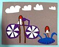 This is so well done, Lara. Not only do I know just what you are describing, but it is a lovely graphic design. The way the clouds get smaller and smaller...the triangles on the wheels of the bike...and then the little white triangle added to the girl in the pool, a smaller version of the one on the bigger girl on the bike. Love it!