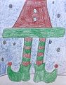 That’s a good-looking elf you drew Mac. I like his pointed ears and his big smile. What’s that J on his pocket stand for? He must be left-handed because his muscle in his left arm is bigger than the one in his right arm! Overall though it’s a good job. Love you, Poppa