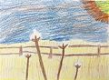 Hey, Mac! I like your cotton theme artwork! Definitely got those cotton stalks growing in rows in the field. I bet that is your pond with the fish in it - yes? Your house and maybe your church in background? Nice job! Keep up the good work. Popple