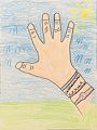 Hey, Mac! This latest of yours is interesting! That is somebody's hand; yours? It is a left hand - you are right-handed, so I bet you outlined your left hand with your right, and then added color? Is that grass with colored marbles? Good job - I like it. Popple