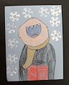 Interesting perspective! Somone (Charlie Brown holding a red book?) is holding his head back and laughing while snowflakes fall.