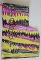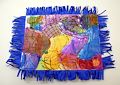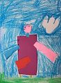 I like the pink and purple body and head,arms and fingers. Teal eyes really show up. Is it a chalk drawing with cut out construction paper triangles? You'll have to tell us about it. Love grammie N