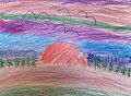 I really love this artwork, Amaya! The different colors of blue in the sky look so real to me and somehow I get the feeling of the wind blowing! The colors you used for the mountains are just beautiful - it's exactly how the mountains look late in the afternoon! I wish I lived in that pretty house and had a snail coming over for a visit. I especially love the warm colors you've chosen for the sun - it looks warm and inviting and makes me dream of summer! Nice job, sweetie!!