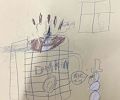Haha! This is perfect for you, Christian, because you always say you are hungry! This is a good drawing of a robot and pepperoni pizza! Next time you can do one that says “Boppa, can I have a bar?” ??