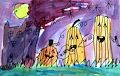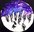 I look at this artwork and see a full moon with purple icing with pink sprinkles in it and black curlicues coming from the icing. Are there two people standing beneath it? Love this piece!