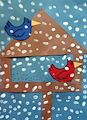 Dear Tori, Feeding birds is one of my favorite things to do. I love the BlueJay who is chowing down on seed in your birdfeeder. The nice red roof is keeping the snow off of his pretty blue feathers. You are a talented artist. Love, Aunt Cindy