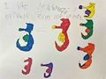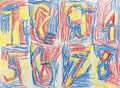 Another great piece by Emerson. In this work, he has substituted numbers for the shapes that he has used as central "eye catchers." Again, Emerson has divided his canvas into individual focal areas, which I find appealing: appealing because I can view the whole work as one, i.e., a sequence of numbers highlighted by his choice of color and or, I can concentrate on an individual section and look forward more sections to view. His use of numbers also suggests to me that he is gaining a good foundational education where he is advancing from shapes to numbers. And to my continued pleasure, Emerson uses yellow generously, which is my favorite color, a happy, bright hue.