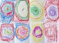 Emerson continues to create work that captures my attention. I see eight rectangular sections, with seven of the eight containing circular images, yet the eighth does not. This break in his consistency makes me study the piece even closer, which feeds my intrigue in wondering, "What else might Emerson have included in his work?" I see a square image in that eighth box (lower right) and I notice that each circle is drawn around a central mark or smaller circle. Finally, enjoying brighter color, I like the green column of color on the right side of this work. I enjoy looking at this art. Well done, Emerson!