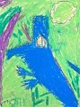 If I know Emerson, this is a gator or a croc springing out of a swamp to eat something on a limb over the water. The wide open mouth, the rows of teeth and the tongue depict a powerful animal in his domain. I really like the solid blue body as well. Is this piece made with pastel chalk? It seems smooth enough to be so. Always enjoys Emerson's work!