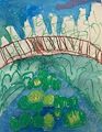 Once again I am awed by what I see: sky, terrain, and a stream/river that is spanned by a bridge. The coloring of the sky and the lighter dots lead my eye to see a mostly clear night where stars and clouds share the above-horizon scene. What I depict as a river and bridge brings me back to my visits to Turku, Finland, where such a sight is actual and lovely as it cuts through Turku. And most of all...Emerson's river gives me the sense of depth perception, where the father the river is from the viewer, the small the river looks. This is an excellent feature which I believe is one of the depictions of Da Vinci's "The Last Supper" where the ceiling lines get nearer to one another as they lead to the back of the room to suggest distance (Be it known though, that I consider the subject of Jesus Christ and His apostles the strongest subject in Leonardo's painting). Well done, Emerson! I remain impressed with your art and with your art teacher.