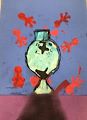 I love this piece because it shows so many different parts of nature. The leaves and greenery show nature's beauty while highlighting a red sky sunset. The road leading to the building looks like spider webs . It represents (to me) the long road and challenge taken to get back home. Well done Tommy!!!