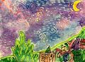 Beautiful colors, and design in the night sky. This is like a Van Gogh. The little houses colorful too.. I always enjoy your art, Abby ??