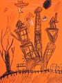 Evelyn, That is a very scary pumpkin, or maybe that pumpkin is scared of the ghosts in the sky. Your artwork always makes me think. I love your creativity and imagination ???