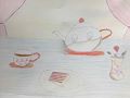 This is a nice Tea Set. I love how the teapot, cup and vase match. Subtle voice of colors too! That 6-layer cake looks yummy!