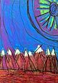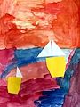 Beautiful colors so interesting. I think it looks like sailboats on the lake with a great sunset, wonderful art work pa pa & nanna