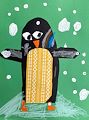 That penguin looks warm with it s fabric hat and shawl ….brrr all those snowflakes . Again you are the best with those bright colors!!