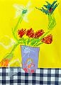 That looks like our tablecloth at the lakehouse! I love your colorful flowers! Your vase has so much detail. Beautiful job!