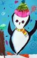 WOW Hudson! This HAPPY penguin makes me think of all the different penguins I saw in Chile, South America!!!! I like the vivid colors of the hat and scarf! But I especially like the unique patterns of the background! Wouldn’t it be nice if it really snowed hearts and curlycues?? You are quite an artist!??