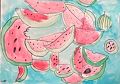 I love this drawing, Leo! I wonder if it was tricky to arrange all the slices so that some were in front and some were in back. Also, it made me smile to see the bites taken out of a few of the watermelons! Well done!!