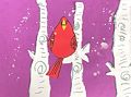 What a lovely winter scene! I really like the whorls on the trees, but I also like the nice, fat cardinal and the spattering of snow on the purple background.