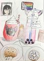 Great idea to show yours and Alice's different choices for a snack. Love the steam coming from the hot chocolate! Also, the bites and crumbs from the cookie!