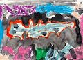 There is so much going on here. It looks like a big building with lots of dark clouds, maybe it's nighttime and the moon is out? Maybe it's a haunted house. I see some gravestones in the front. Spooky! Great job Elena, so creative. <3