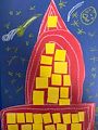 I am enjoying your artwork "reaching the moon". The blue background really brings out the brightness of the stars and the moon. The popsicle sticks are arranged in an artistic way to build the flight of stairs. I simply love the image of the little boy just about to reach the moon. Looks like he has put in a lot of effort to get there. Congratulations!