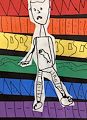 Is this a picture of you, Bennett? I like the patterns on the rainbow colored background and the details on your shirt and pants. Why do you look sad?