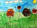 Evie, That is a beautiful painting of flowers, grass, the sky, clouds and the sun. I like your colors. You make me happy.