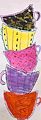 Those cups are very colorful. They are very carefully stacked up high. The cupboard they go in must not be very tall.