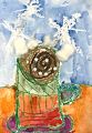 I am very curious about how you created this artwork. It looks like the border is colored in crayons. Then it looks like the blues and purples are painted with a flat brush in watercolor. And on top of that an ink drawing of a fish has appeared! Very nice!
