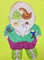 I want you to know how much it means to me to know who you are: what you like, what is important to you, and what you value. Thank you!! Also, I like the lime tie shoes and the big head with the pointed nose! A lot in that head. You expressed your love of animals and your empathy and compassion for humans and animals. Great heart you have!
