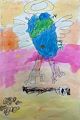 I really like the colors of the sky, it reminds me of a sunset, and how the world looks like an angel, it's very cute.