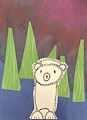 What a cute polar bear sitting by the evergreen trees.
