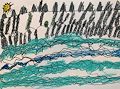 Ada! This artwork reminds me of the mountains in Vermont at Smuggs! I wonder what you were thinking about when you created it! I love the perspective and sizing. And the wavy lines and different blue-greens at the bottom. Love, Nana