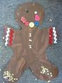 It is a gingerbread man and I put clothes on him by using sparkly things and buttons. One button fell off when I brought it home but it is still very nice. I like gingerbread men but you can't eat this one because of the sparkly stuff and it is paper not a cookie. Love, Jakob, the artist
