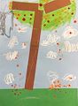 I love your nice green tree, Aaron! It looks like someone is shaking it because apples and leaves are falling from the tree. Is that a squirrel on the left that is jumping around and that is why everything is falling?? Great imagination! By the way, I love you very much!