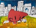 Looks like the Dino is sitting in traffic just waiting his turn. The artwork is great. The dino looks like he is really patient in the city.